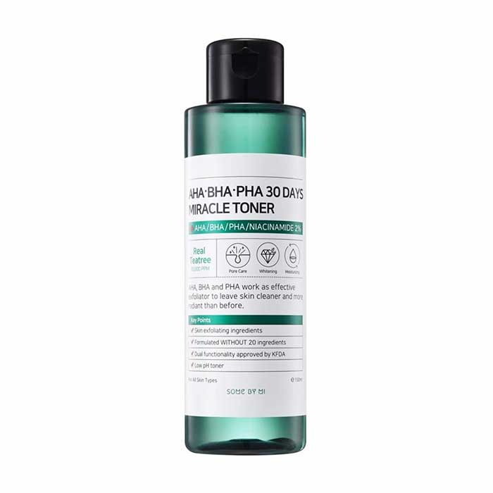Toner s prírodnými kyselinami AHA, BHA a PHA určený na ošetrenie pleti s akné. Vďaka kombinácii prírodných kyselín, rastlinných extraktov a nízkej hodnoty pH 5.5 toner jemne exfoliuje odumreté bunky pokožky, účinne odstraňuje všetky nečistoty z pórov pokožky, eliminuje čierne bodky a akné, zanecháva pokožku hladkú, pružnú a žiarivú. Toner SOME BY MI s kyselinami AHA, BHA a PHA pôsobí ako účinný exfoliátor, takže pokožka je čistá a žiarivá. Okrem toho obsahuje extrakt z čajovníka s koncentráciou 10 000 ppm, vhodný pre všetky typy pleti. Receptúra tonera je založená na koncentrovaných prírodných rastlinných výťažkoch, bohatých na prírodné kyseliny s protizápalovými, upokojujúcimi a liečivými vlastnosťami, ktoré pôsobia ako dezinfekčné a protiplesňové látky a sú účinným liekom na rôzne problémy s pokožkou náchylnou na akné.